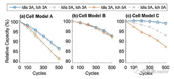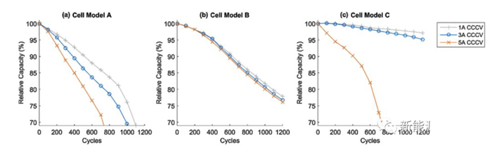 下圖為采用CCCV充電策略時不同的充電電流對于電池循環(huán)壽命的影響,從圖中能夠看到對于電池A,大充電電流會造成電池壽命的顯著下降,例如1A充電時電池的壽命可達(dá)1000次,3A充電時電池的壽命就會下降到800次,而充電電流達(dá)到5A時電池的壽命則僅為600次左右。但是對于電池B不同的充電電流對于電池的循環(huán)壽命并沒有顯著的影響。對于電池C在1A充電時電池循環(huán)1200次后容量保持率仍然可以達(dá)到97%,3A充電時電池循環(huán)1200次后容量保持率為95%,但是在5A充電時電池壽命會發(fā)生快速衰降,壽命不足700次。